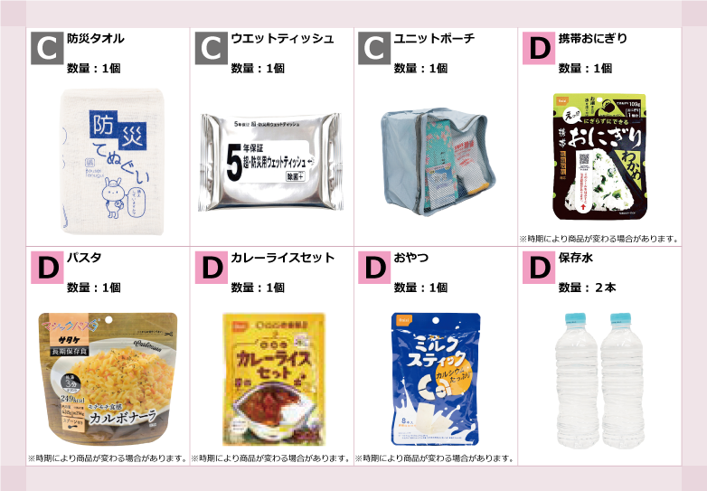 | 消耗品の定期送付 | Cユニット(防災グッズ消耗品)は、年に1度、自動配送いたします。(送料は当社負担) ご希望者には、いつでも追加配送可能です。(別途有料、送料お客様負担) |